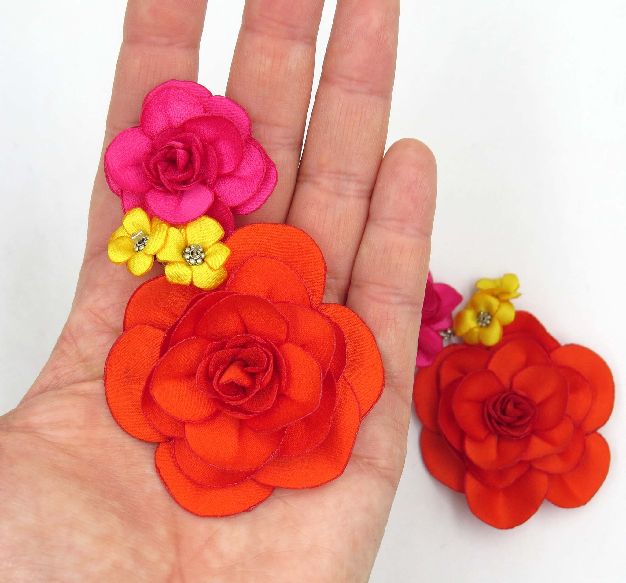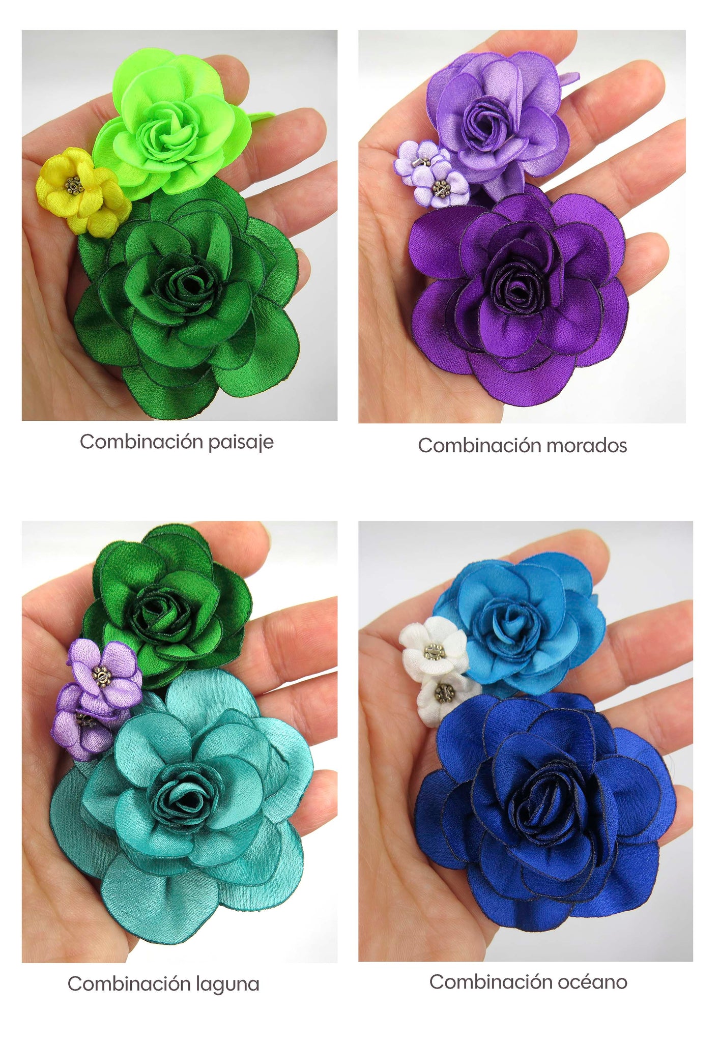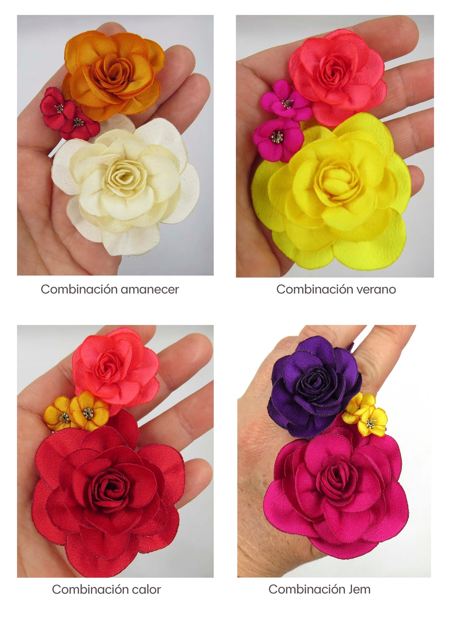 Flores de crepé piel de ángel (seda acrílica) 5, 5 cm de diámetro la flor más grande, 3 cm de diámetro las medianas con pin posterior de plata. Dos flores pequeñas sagitarias. Aros grandes con movimiento.