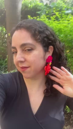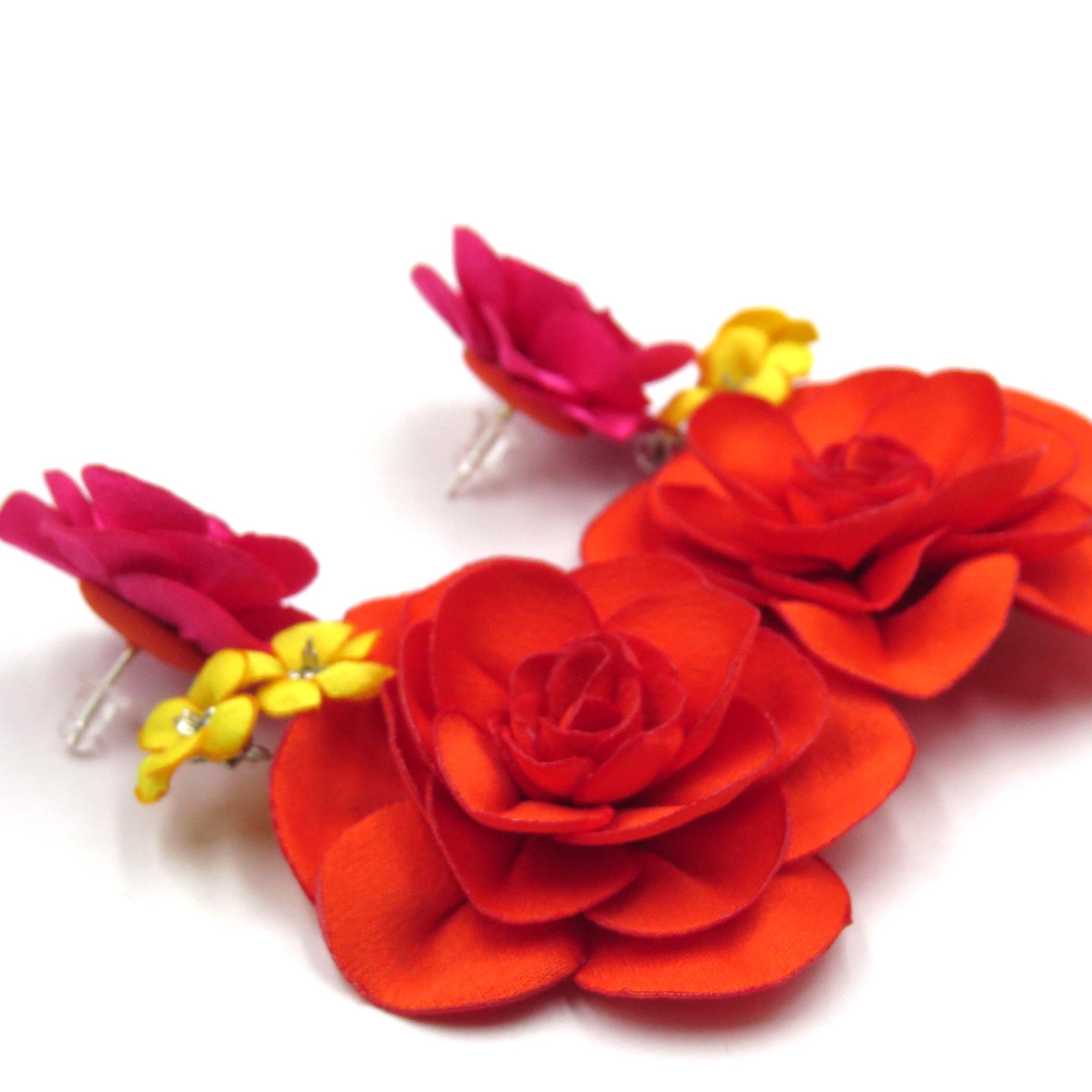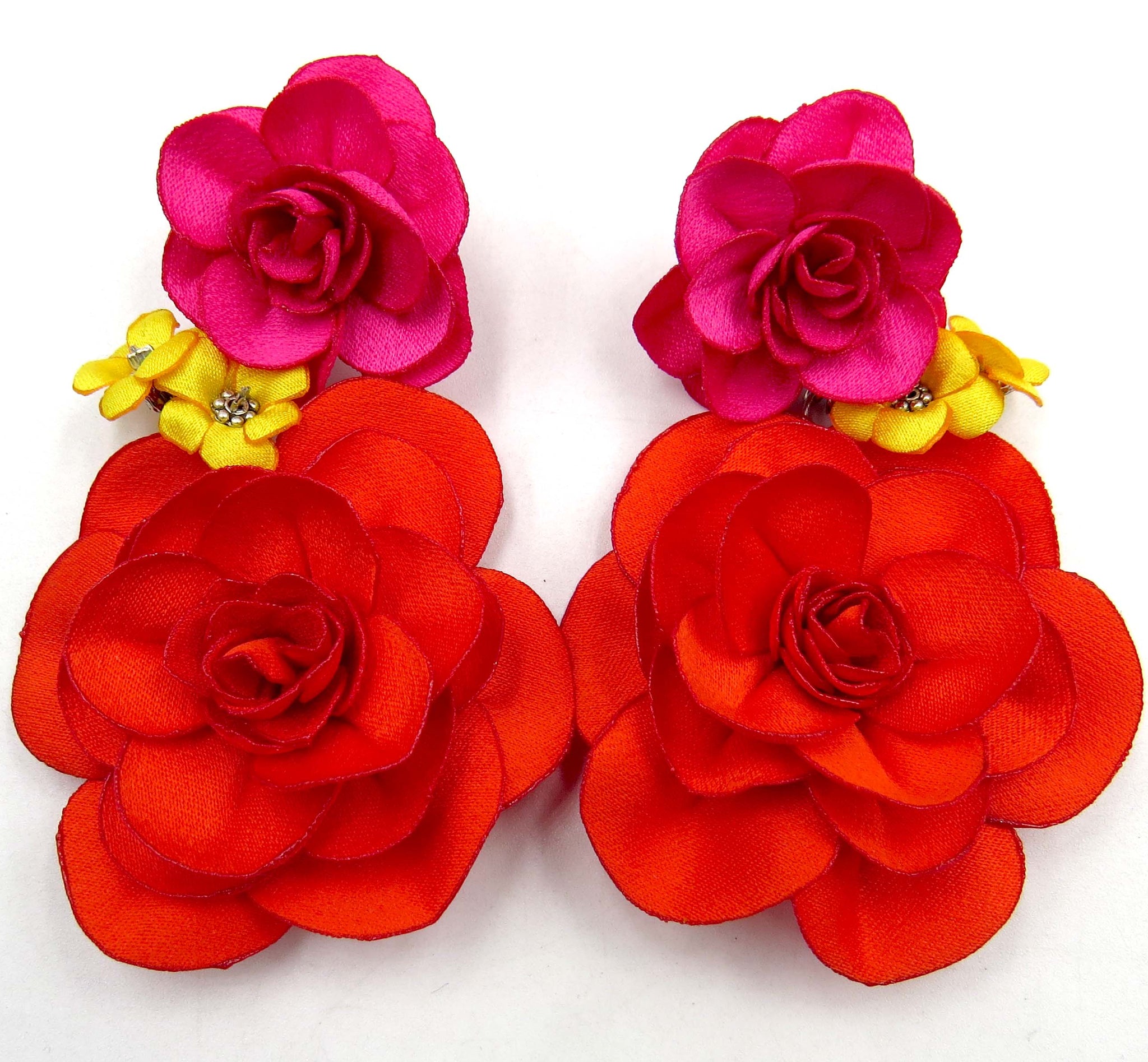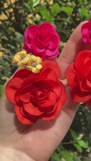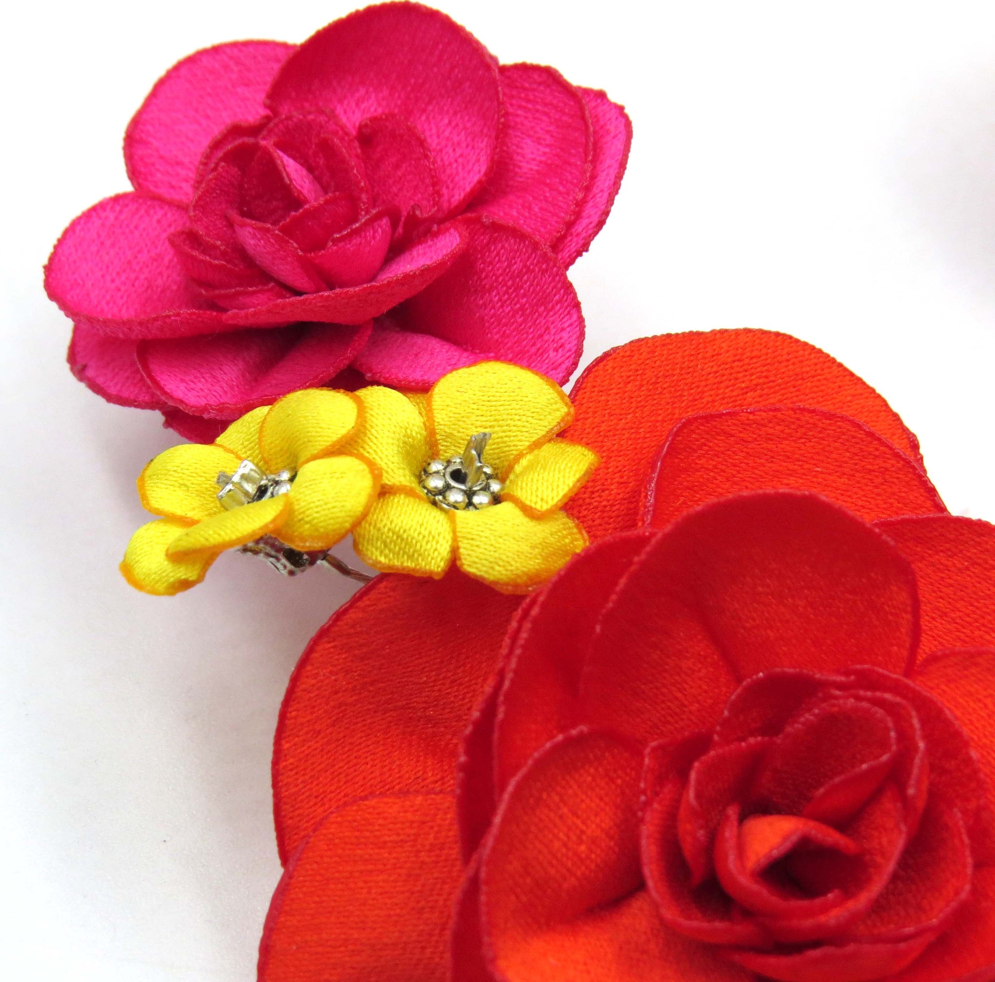 Flores de crepé piel de ángel (seda acrílica) 5, 5 cm de diámetro la flor más grande, 3 cm de diámetro las medianas con pin posterior de plata. Dos flores pequeñas sagitarias. Aros grandes con movimiento.