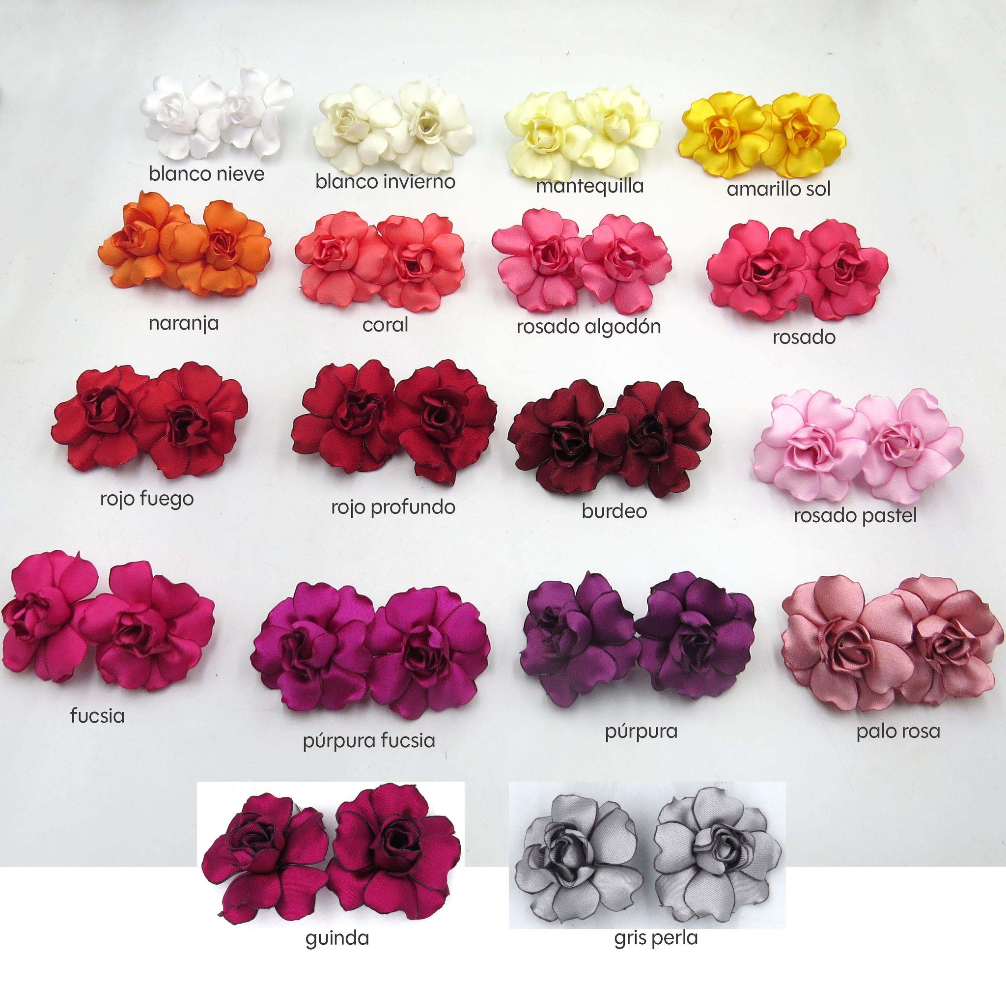 Flores de raso opaco, diámetro aproximado 4cm. largo 5,5 a 6 cm. Ganchos de alpaca modelados a mano (M 4/5)